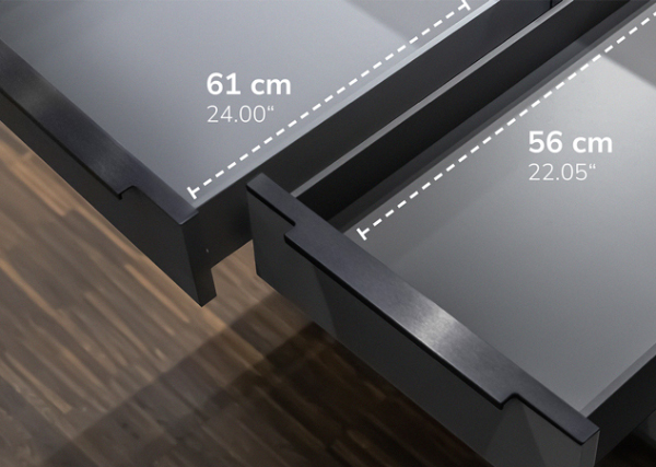 Der SLD SlimLine Drawer vereint filigranes Design mit höchster Stabilität. Die nur 8 mm dünne Metallzarge sorgt für eine edle Optik, während die integrierte LED-Beleuchtung für optimale Sicht in jeder Schublade sorgt. Ergänzt durch die OrganiQ Innenorganisation aus Echtholz bietet dieses System eine elegante und praktische Aufbewahrungslösung.